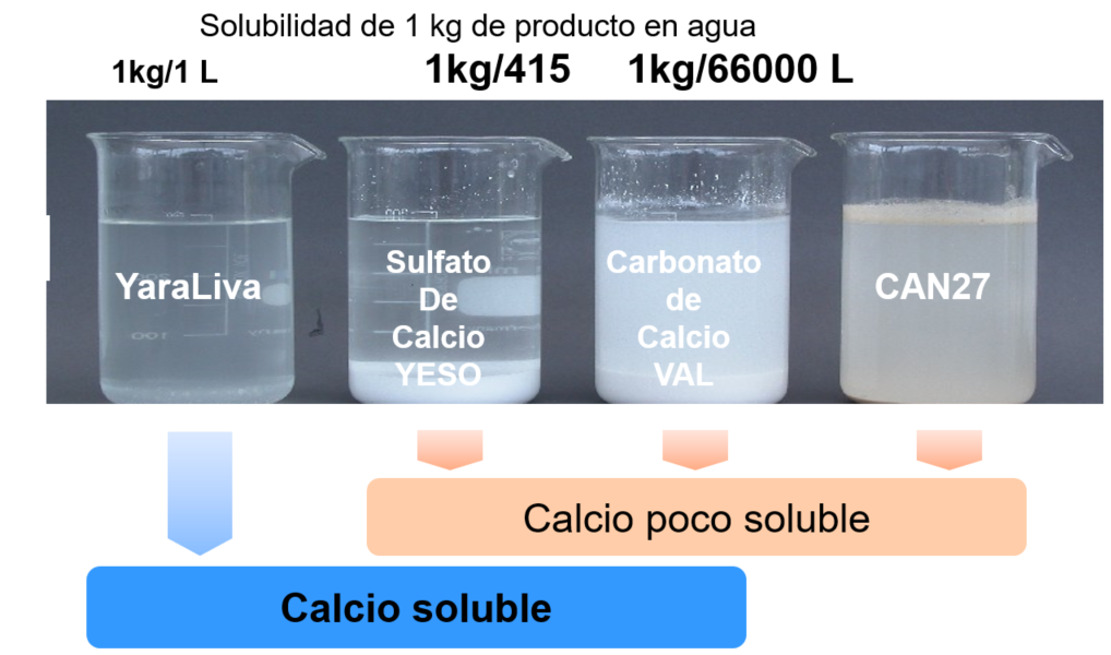 Este tipo de suelos van desde los 6 pH hasta los 4 pH. Es importante tener bien definido la fuente de Calcio y la cantidad adecuada a ser aplicada, ya que al ser una enmienda, disminuiremos un problema como es el nivel bajo de PH. Se sabe que en el cultivo de aguacate se tiene una ventana pequeña para impactar calidad y cantidad de frutos (amarre) y es muy importante el Calcio como nutriente en este momento. Muchos productores tienen la idea que al aplicar enmiendas como Carbonato de Calcio CaCO3 cumplimos los requerimientos totales de Calcio en el cultivo que pueden ser de hasta 1 kg/Ton producida. La solubilidad de una fuente de Calcio es fundamental ya que muchas de las veces son poco o incosteablemente insolubles. Un ejemplo de esto es la cantidad de agua que se requiere para solubilizar un kilogramo de Carbonato de Calcio que es de 66,000 litros; por otro lado una fuente más soluble como es el Nitrato de Calcio que requiere solo un litro de agua para disolver un kilogramo. Por lo tanto la solubilidad es un factor importante al aportar una fuente de Calcio.