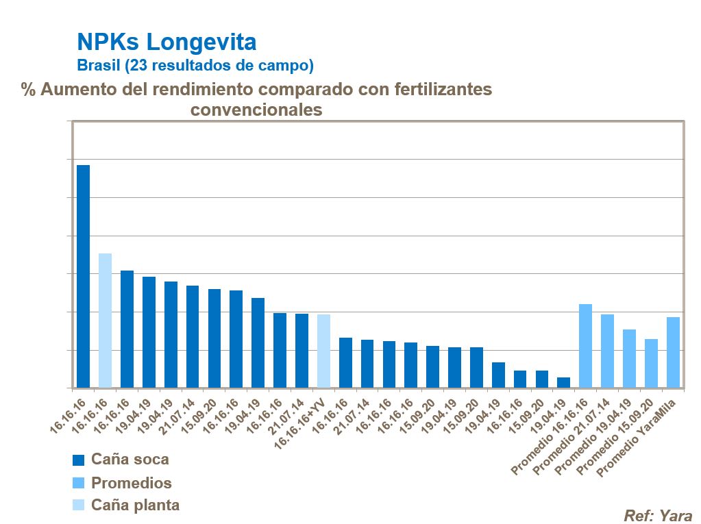 Se han probado diversas formulaciones de YaraMila. Todas ofrecen menor pérdida de N en la producción de caña verde debido al uso de nitrógeno en forma de nitrato y una mejor disponibilidad de P usando una mezcla de formas de fósforo rápidamente disponibles. Ensayos con estos productos YaraMila han mejorado el rendimiento de la caña en un promedio del 20%. En una segunda serie de ensayos, el uso de YaraMila NPKs fue complementado con la aplicación de YaraVita Bortrac y Zintrac, para brindar aún mayor consistencia al cultivo.