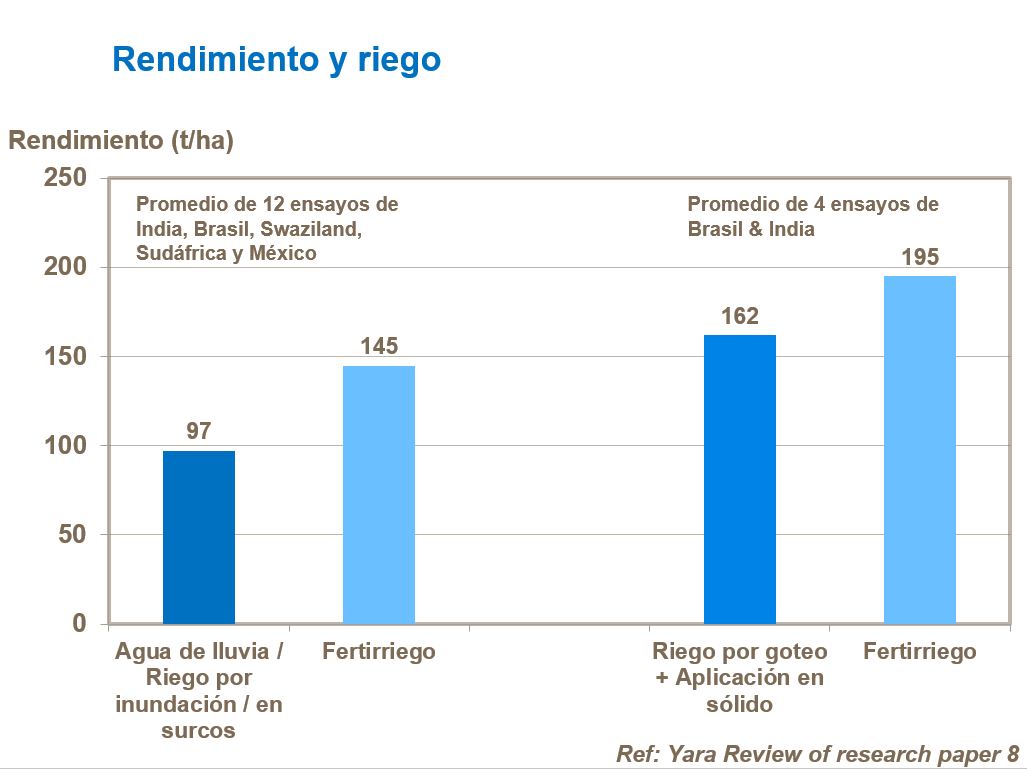 Solamente un 1 % del cultivo de caña alrededor del mundo utiliza fertirriego. Sin embargo, esta práctica ofrece un gran potencial para maximizar el rendimiento y aumentar las ganancias por la cosecha. Comparados con el agua de lluvia y con otras formas de irrigación, el fertirriego de caña de azúcar tiene un impacto marcado en el rendimiento. Suele ser una forma más eficiente de aplicar fertilizante que la aplicación de sólidos.