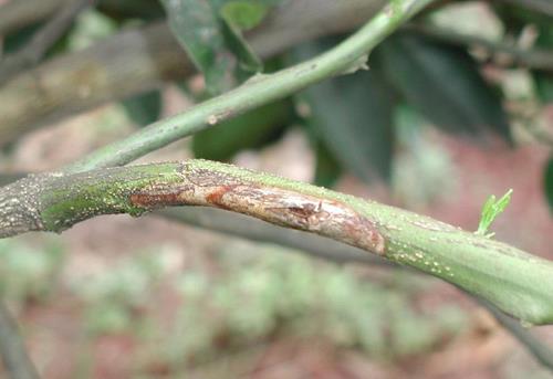 Puede producirse la la muerte de ramas y es posible que aparezcan exudaciones gomosas bajo la corteza nueva o en los frutos.