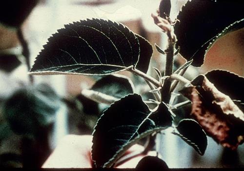 Las yemas terminales mueren. Las hojas jóvenes primero se vuelven cloróticas, y después los márgenes se queman y enrollan hacia dentro.