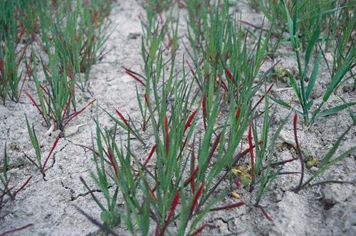 Las plantas reducen su crecimiento y muestran tonos violáceos en el tallo.